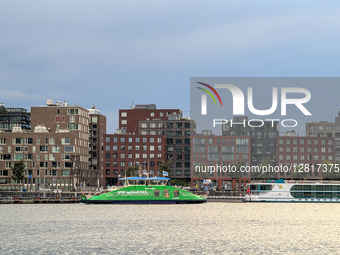A passenger ferry operates on the IJ river near Amsterdam Centraal station in Amsterdam, Netherlands, on September 10, 2025.