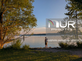 A man stands fishing in the evening on the shore of Lake Starnberg in Starnberg, Upper Bavaria, Bavaria, Germany, on July 1, 2025.