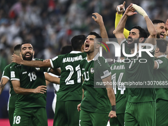 Players of Palestine celebrate after qualifying for the knockout stage after the Group A FIFA Arab Cup 2025 match between Syria and Palestine at Education City Stadium in Doha, Qatar, on December 7, 2025.