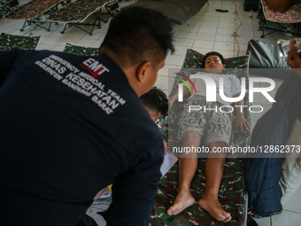 A vocational school student gives a statement to health workers while receiving treatment for food poisoning after consuming free government-subsidized school meals at SMPN 1 Cisarua in West Bandung Regency, West Java, Indonesia, on October 15, 2025. According to preliminary data, approximately 300 students, including elementary, middle, and vocational high school students, experience food poisoning suspected to be caused by consuming the free nutritious meal on Tuesday, October 14, 2025, in the morning.