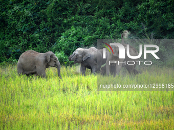 A herd of wild elephants gathers near a rice paddy field in search of food in Nagaon district, Assam, India, on November 17, 2025.