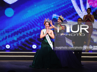 Urusha Bhandari, winner of Miss Nepal International, is crowned with the title by the reigning winner of 2024 after the final announcement in Lalitpur, Nepal, on August 30, 2025.