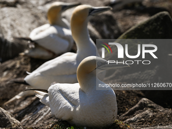 GREAT SALTEE, IRELAND - MAY 21: Gannets during the breeding season on Great Saltee Island, on May 21, 2024, in Great Saltee, Saltee Islands, County Wexford, Ireland. The uninhabited Saltee Islands off Ireland's southeastern coast are a seabird paradise and crucial breeding ground for species like fulmars, gannets, shags, kittiwakes, guillemots, razorbills, and puffins, situated along an important migration route.