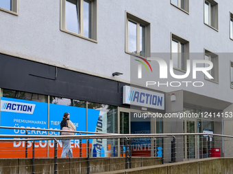 Pedestrians pass by and enter an Action discount retail store located on the ground floor of a multi-story building in Munich, Upper Bavaria, Bavaria, Germany, on May 26, 2025. The storefront features large promotional signage and a prominent logo above the entrance. The store offers low prices on everyday products and premium brands.