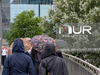 People walk with umbrellas in rainy weather along a pedestrian bridge near Berlin Hauptbahnhof, with modern buildings in the background, in Berlin, Germany, on July 21, 2025.