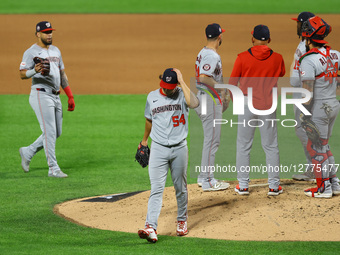 Washington Nationals starting pitcher Andrew Alvarez (54) is removed from the game during the fourth inning of the baseball game against the New York Mets at Citi Field in Corona, N.Y., on September 19, 2025.