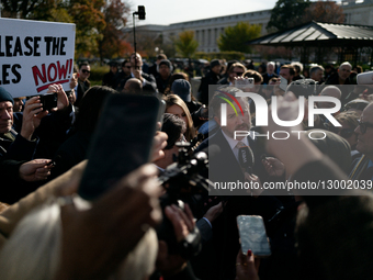 U.S. Representative Thomas Massie (R-KY) speaks to members of the media following a press conference about the Epstein Files Transparency Act, which calls for the release of all unclassified documents in the Jeffrey Epstein case, at the U.S. Capitol in Washington, D.C. on November 18, 2025. The House of Representatives is scheduled to vote today on the release of the files.