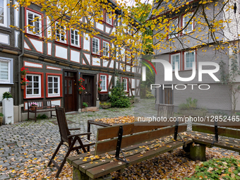 A quiet courtyard with benches, a tree, and half-timbered houses is covered in autumn leaves in Alsfeld, Germany, on October 10, 2025. The historic small-town setting reflects typical autumn weather in central Germany.
