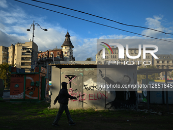 BUCHAREST, ROMANIA – OCTOBER 10: A mural in the style of Banksy depicting Elon Musk making a raised-arm salute, seemingly referencing Trump’s second inauguration, is displayed on a tourist information kiosk with added inscriptions 'Heil Elon' and a swastika, seen in Bucharest, Romania, on October 10, 2025.