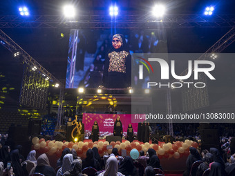 A young veiled Iranian girl performs in a celebration introducing Iran's 1404 Lady of the Year, held in commemoration of National Mother's Day at a sports hall in downtown Tehran, Iran, on December 10, 2025. The Lady of the Year Ceremony in Iran is similar to international Miss contests. However, in this event, a group called Mesl-e Haniyeh introduces an Iranian woman or girl who achieves accomplishments in cultural, sports, religious, hijab, or scientific fields.