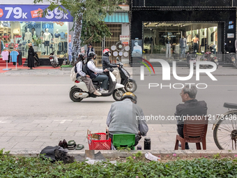 People on a sidewalk in Thanh Hoa, Vietnam, on March 19, 2025, engage in various activities such as socializing, selling goods, sitting, observing the street, and riding motorbikes. Some play games, converse, or wait, while others are involved in small roadside businesses.