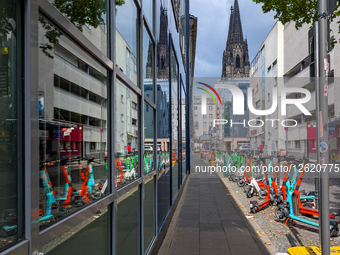 Numerous e-scooters from different mobility providers are parked in Cologne, North Rhine-Westphalia, Germany, on August 3, 2025.
