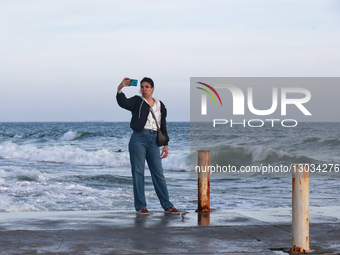 A woman takes a selfie on a traverse during a storm in the Black Sea in Odesa, Ukraine, on November 27, 2025. Fences are installed in the Arkadiia area, preventing people from accessing coastal protection structures such as dams, traverses, piers, and breakwaters.