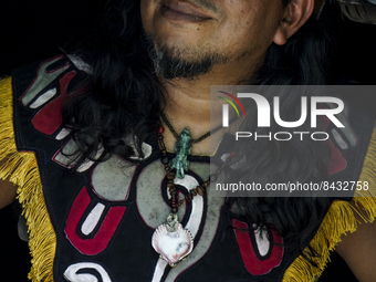 Amilcar, a Pipil dancer poses for a picture during a summer solstice celebration on June 26, 2022 in Izalco, Sonsonate, El Salvador. The summer solstice takes place on June 21st marking the beginning of the rainy season for the Pipil indigenous people of El Salvador.