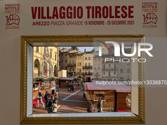 A large informational and photographic sign promotes the Villaggio Tirolese (Tyrolean Village) Christmas market, which is visible within the sign's frame, located in Piazza Grande, Arezzo, Tuscany, Italy, on November 20, 2025. The sign indicates the market runs from November 18 to December 28, 2025. The scene captures the festive atmosphere of the historic city center, showing wooden market stalls, a decorated Christmas tree structure, and people browsing the square, surrounded by the Renaissance and medieval architecture of the Piazza Grande.
