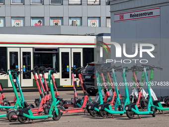 E-scooters park near Augsburg Main Station in Augsburg, Bavaria, Swabia, Germany, on August 23, 2025. The area around the station serves as a hub for mobility and public transport with trams, buses, and rental scooters.
