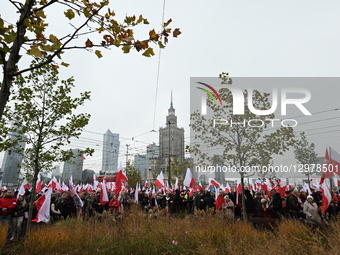 WARSAW, POLAND - NOVEMBER 11, 2025: Participants carry national flags during the Independence March commemorating the 107th anniversary of Poland's return to sovereignty, in Warsaw, Poland, on August 15, 2025. Thousands gathered in the capital to mark National Independence Day.