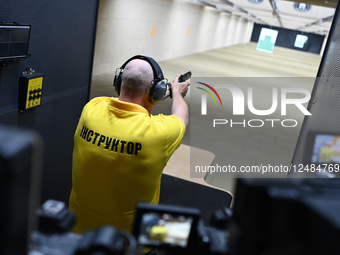 An instructor in shooting earmuffs points a handgun at a target at the Strilnytsia municipal shooting range in Lviv, Ukraine, on June 17, 2025.