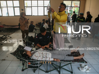 A vocational school student gives a statement to health workers while receiving treatment for food poisoning after consuming free government-subsidized school meals at SMPN 1 Cisarua in West Bandung Regency, West Java, Indonesia, on October 15, 2025. According to preliminary data, approximately 300 students, including elementary, middle, and vocational high school students, experience food poisoning suspected to be caused by consuming the free nutritious meal on Tuesday, October 14, 2025, in the morning.