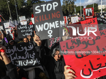 A feminist activist raises a placard reading ''no women's liberation without decolonization'' during a march organized by feminist groups, including the Tunisian Association of the Democratic Women (ATFD), in Tunis, Tunisia, on November 29, 2025. The demonstration brings together hundreds of human rights defenders, feminist activists, opposition parties, civil society members, and ordinary Tunisians to denounce what protesters describe as a growing crackdown on freedoms, criminalization of civil society, and restrictions on public space imposed by Tunisian authorities. Participants also condemn the suspension of the activities of dozens of associations and organizations, as well as the rising gender-based violence. They show solidarity with opposition figures recently sentenced on appeal in the ''conspiracy against state security'' case.