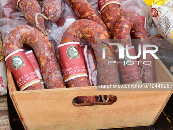 Italian sausage is at the Italian Gastronomy Village to showcase Italian culinary products in Place Saint Jean, Lyon, France, on June 5, 2025.