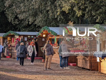 Shoppers browse various wooden stalls illuminated by festive lights and garland at a Christmas market in Arezzo, Tuscany, Italy, on November 20, 2025.