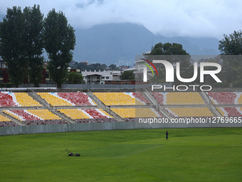 A general view of the Tribhuvan University (TU) Cricket ground in Kathmandu, Nepal, on September 18, 2025, shows it undergoing a complete makeover. The stadium has a capacity of 10,000 spectators, divided into two sections.