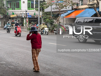 An elderly woman wearing a red sweater and floral pants waits to cross a multi-lane road as motorbikes and cars move through the intersection in Hanoi, Vietnam, on March 27, 2025. She holds her hat with one hand while traffic continues along a busy stretch near Nguyen Du and Hue Streets, lined with shops and parked motorbikes.