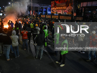 Protesters burn a roadblock during a demonstration in front of the Malang city police headquarters in East Java, Indonesia, on August 29, 2025. Protesters demand economic justice and government accountability as tensions rise in Jakarta and elsewhere following the death of a ride-share driver, who is killed after a police vehicle strikes him during demonstrations over living costs and wage reforms.