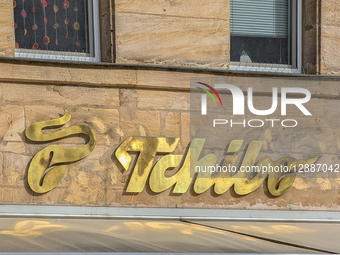 A close-up view of the golden Tchibo logo sign appears on a store facade in Schwabach, Franconia, Middle Franconia, Bavaria, Germany, on October 20, 2025. The German retail and coffee brand Tchibo combines coffee sales with household and lifestyle products.