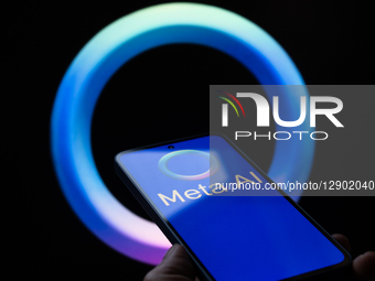 The Meta AI displays on a mobile phone with the company's branding visible in the background, in this photo illustration in Brussels, Belgium, on October 24, 2025.