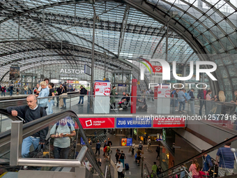 Train passengers are in the station hall of Berlin Main Station in Berlin, Germany, on July 21, 2025. The station serves as a major hub for long-distance, regional, and local rail connections, with travelers moving between ticket machines, shops, and platform levels beneath the multi-level structure.