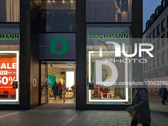 The entrance and window display of the Deichmann footwear retailer feature large promotional signage and shoppers move in and out of the store. The store is located in Munich, Bavaria, Germany, on December 5, 2025. Deichmann SE is one of Europe's largest footwear retailers, operating internationally and offering a wide selection of shoes and accessories.