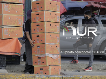 Banana vendors on Taxqueña Avenue and Tláhuac, Mexico City, near a market and self-service shop during the Buen Fin sales during the COVID-19 health emergency and the green epidemiological traffic light in the capital.