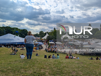 People attend the Summer Tollwood Festival with food stalls, gift stands, and beer garden seating in Munich, Bavaria, Germany, on July 10, 2025.
