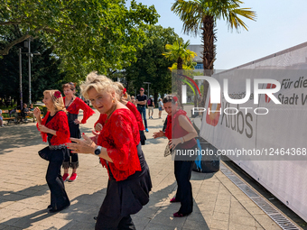Senior citizens participate in a dance activity organized by ''Die Pensionist*innenklubs'' (Pensioner Clubs) of the City of Vienna at Karlsplatz in Vienna, Austria, on June 10, 2025. The event is part of a community program supported by the municipality to promote social engagement and active lifestyles among elderly residents.