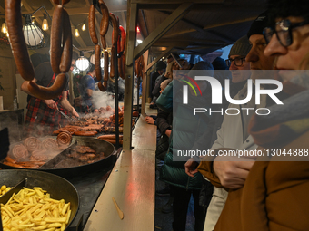KRAKOW, POLAND – NOVEMBER 29: A stall selling traditional Polish culinary specialties, including pork-based dishes, is seen as a dense crowd of tourists and locals fills the Christmas market in Krakow’s Main Market Square, in Krakow, Poland, on November 29, 2025.