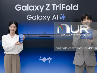 Event staff display the Galaxy Z TriFold for the media during a launch showcase at Samsung Gangnam in Seoul, South Korea, on December 2, 2025. The device officially launches on December 12 in South Korea and rolls out to global markets, including China, Taiwan, Singapore, the United Arab Emirates, and the United States. It is sold through Samsung.com and 20 retail locations nationwide with 16GB of memory, 512GB of storage, and a single ''Crafted Black'' color option, priced at 3,590,400 won.