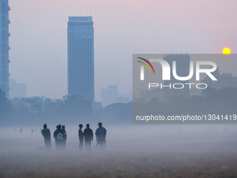 People stand on the ground on a foggy winter morning in Kolkata, India, on November 30, 2025.