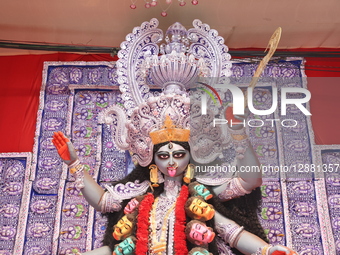 A huge clay idol of the Hindu goddess Kali is inside a ''pandal'' (a temporary platform), a decorated structure, ahead of the Kali Puja festival in Kolkata, India, on October 19, 2025.