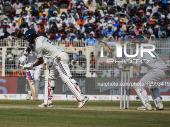 Ravindra Jadeja hits a four during the first innings play by India on day 2 of the India vs South Africa test match at Eden Garden Cricket Ground in Kolkata, India, on November 15, 2025.