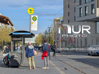 People wait at the Pasing Station tram and bus stop near shops and cafes in the modern district outside Munich Pasing Station in Munich, Bavaria, Upper Bavaria, Germany, on April 21, 2025. The stop serves tram line 19 and connects with local transportation and shopping areas.