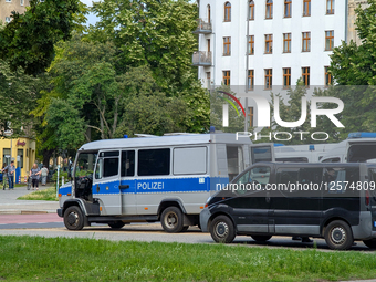 Police vehicles are at Oranienplatz in the Berlin district of Kreuzberg in Berlin, Germany, on July 19, 2025. A larger police deployment is visible in the area, involving multiple vans of the Berlin police.