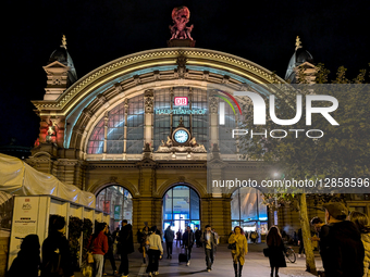 The exterior of Frankfurt Central Station (DB Hauptbahnhof) is illuminated at night in Frankfurt am Main, Hesse, Germany, on October 10, 2025. People walk in front of the historic station building, one of Germany’s busiest railway hubs.