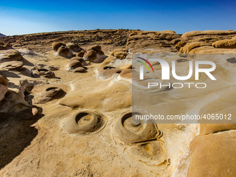 Petrified round spherical peculiar volcanic rock formation like sculptures made of Lava at the geological park of Faraklo or Falakro near the beach coast in Lemnos or Limnos island, located in North Aegean Sea in Greece. The rocks are showing the unique amazing volcanic history of the geology with evidence of volcano eruption, lava flows and rounded volcanic formations, the area is protected and characterized as a Geological Park.