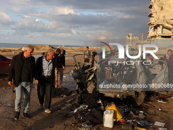Palestinians inspect the remains of a destroyed vehicle targeted by the Israeli military in Gaza City, Palestine, on December 13, 2025. Gaza's civil defense agency says four people are killed in an Israeli airstrike on the Palestinian territory on December 13.