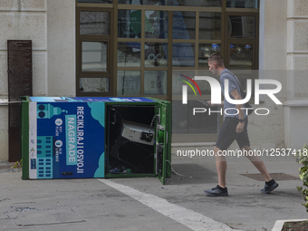 A young man walks past a reverse vending machine knocked over by strong winds in Novi Sad, Serbia, on July 7, 2025. The stormy weather follows a period of intense heat, reflecting a growing trend of extreme weather events associated with climate change.