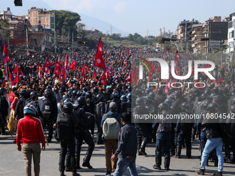 Pro-monarchy protesters are marching in Kathmandu, Nepal, on November 23, 2023, demanding the return of the banished monarchy. Thousands of protesters are clashing with security personnel as they attempt to break into the restricted zone, calling for the restoration of the monarchy that was formally abolished in 2008.