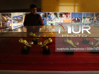 A visitor looks at a Golden Boot model inside a temporary museum ahead of Lionel Messi's India tour in Kolkata, India, on December 11, 2025. To make the GOAT feel 'at home', Kolkata's Argentina football fan club recreates Messi's Miami residence in Salt Lake, Kolkata. The recreated house includes a terrace with statues, terracotta roofs, and life-sized cutouts of Messi's family. A museum-style gallery displays Messi's career through replicas of his trophies, including the World Cup. The ceiling holds 896 footballs for each Messi goal, while a 200-meter LED wall shows his highlights. Organizers charge a INR10 entry fee to manage crowds and track visitors.