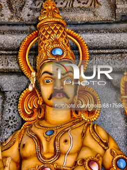 Statue of a guardian at the entrance of the at the Arasadi Vinayagar Temple (Arasadi Sithi Vinayagar Kovil) in Jaffna, Sri Lanka.